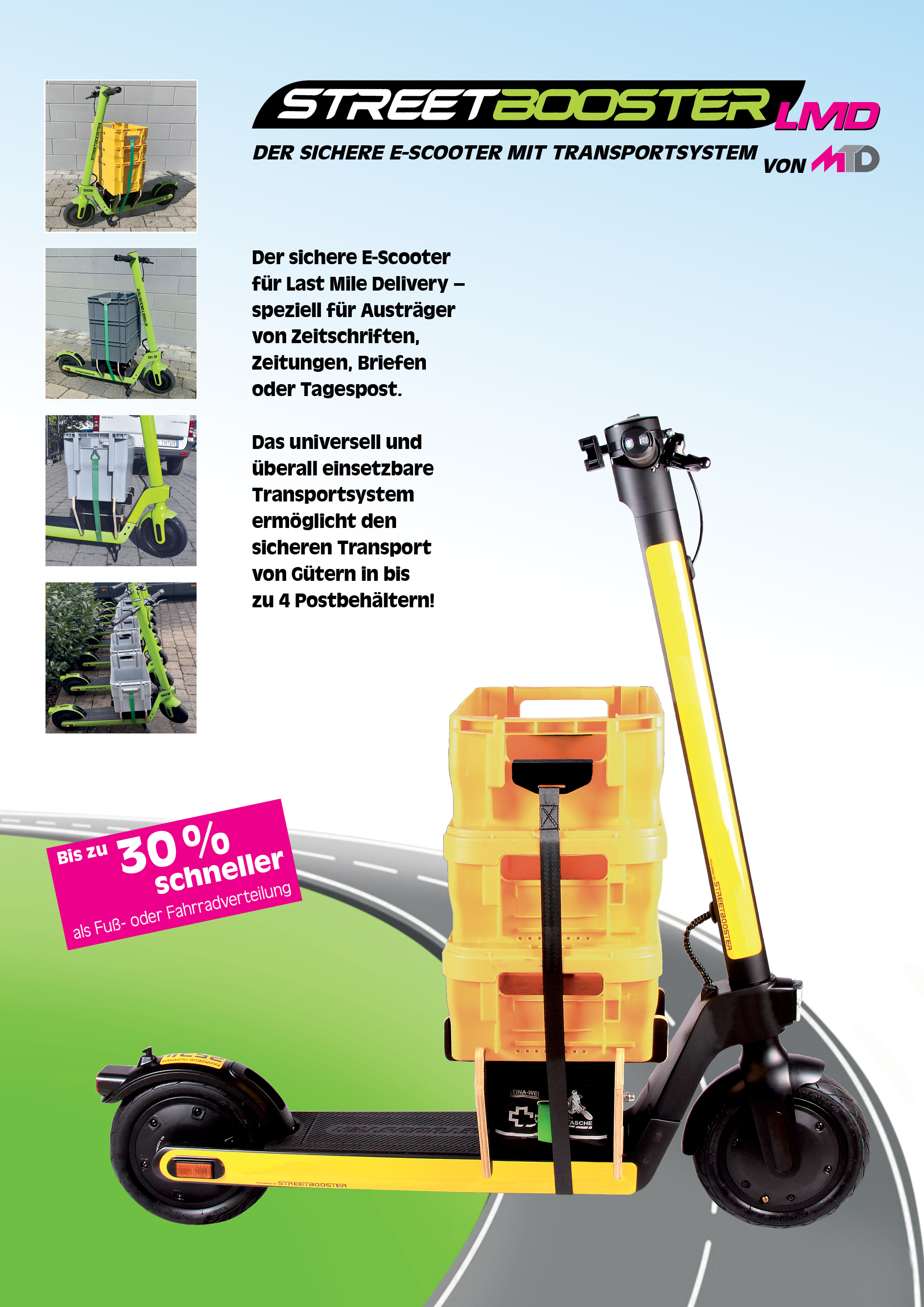 Der STREETBOOSTER LMD ist ein weiterentwickelter E-Scooter, der speziell für „die letzte Meile“ bei der Zustellung von Zeitschriften, Zeitungen oder der Tagespost entwickelt wurde.